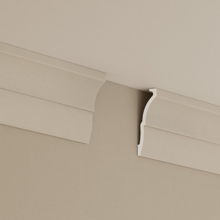 Плинтус Cosca Decor изготовлен из ударопрочного экополимера – это композит с добавлением светостабилизатора. Материал изделия уже огрунтован в своей массе, благодаря чему его можно не окрашивать. Он сохранит белый цвет и не пожелтеет со временем. Красить также легко, с экономией на краске, так как грунтовка уже есть!